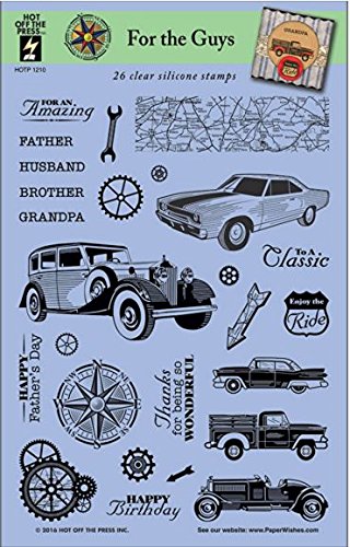 -. Binding : Kitchen -. Brand : Hot Off The Press -. Color : Clear -. EAN : 0035788012105 -. Feature : Clear Stamps by Hot Off the Press are for use with a clear acrylic block (sold separately) / Masculine themes include classic cars, gears, tools, greetings & sentiments, accent stamps and more. / Overall size of sheet is approx 6x8-inches / Sheet contains 26 stamps made from high quality silicone / The first image shows stamp designs. Any other photos are card designs showing the creative possibilities using this set. Images not included -. IsAutographed : 0 -. Label : Hot Off the Press -. Manufacturer : Hot Off the Press -. Model : HOTP1210 -. MPN : HOTP1210 -. PackageQuantity : 26 -. PartNumber : HOTP1210 -. ProductGroup : Home -. ProductTypeName : HOME -. Publisher : Hot Off the Press -. Studio : Hot Off the Press -. Title : HOTP Clear Stamps - For the Guys - Silicone Stamps HOTP1210 -. UPC : 035788012105