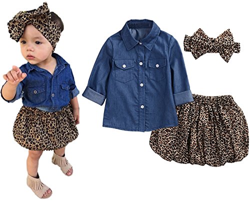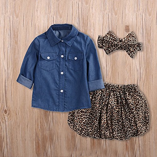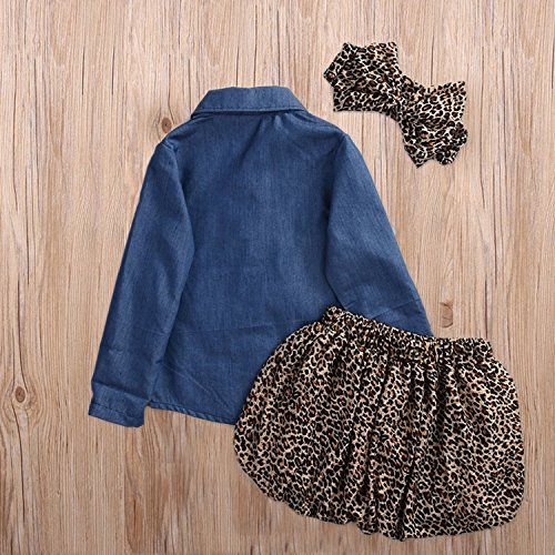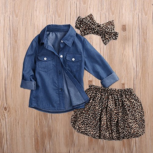 -. Feature : Material: Cotton Blend / Long sleeve denim shirt,fashion leopard skirt,beautiful design with headband / Suitable for ages 1-5 Years girls / Occasion:Playing;Casual Wearing;Photo Outfit;Family Party;Birthday;Daily / Package include:1x baby girls denim shirt,1x leopard skirt,1x headband