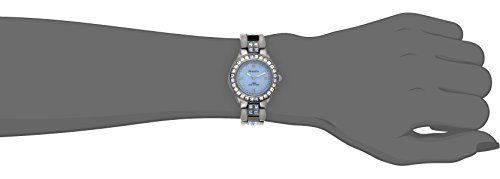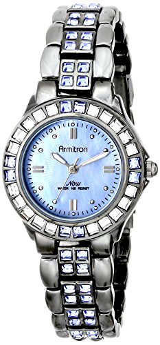 Round watch in gunmetal tone featuring blue mother-of-pearl dial and 28 Swarovski crystals in bezel