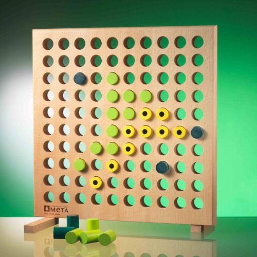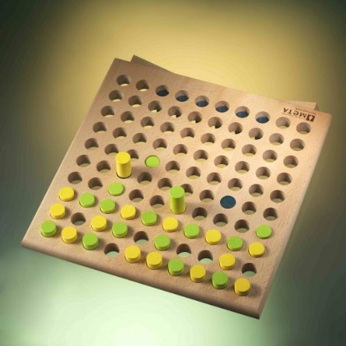 Meta/Esca - das Spielbrett steht zwischen den Spielern. Ziel ist es, 2 x 5 Steine in eine Reihe zu bekommen. Bei jedem Spielzug dürfen 2 Steine gesteckt werden, dabei muss aber ein Spielstein des Partners wieder aus dem Brett geschoben werden. Der eigene Spielstein nimmt dessen Platz ein.