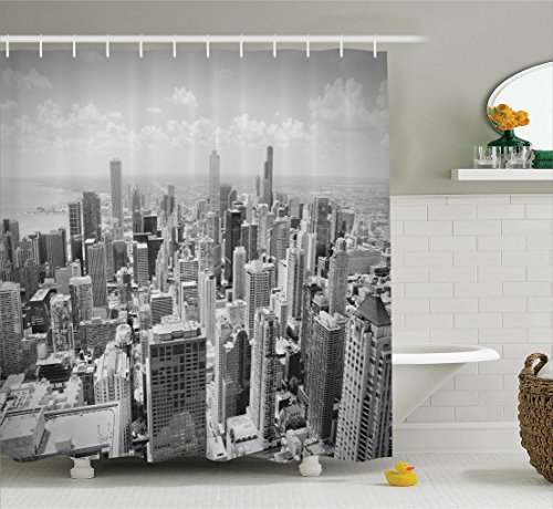 Ambesonne Apartment Decor Collection, Chicago Skyline Aerial View Contemporary Famous Touristic Places Picture Pattern, Polyester Fabric Bathroom Shower Curtain Set with Hooks, Gray