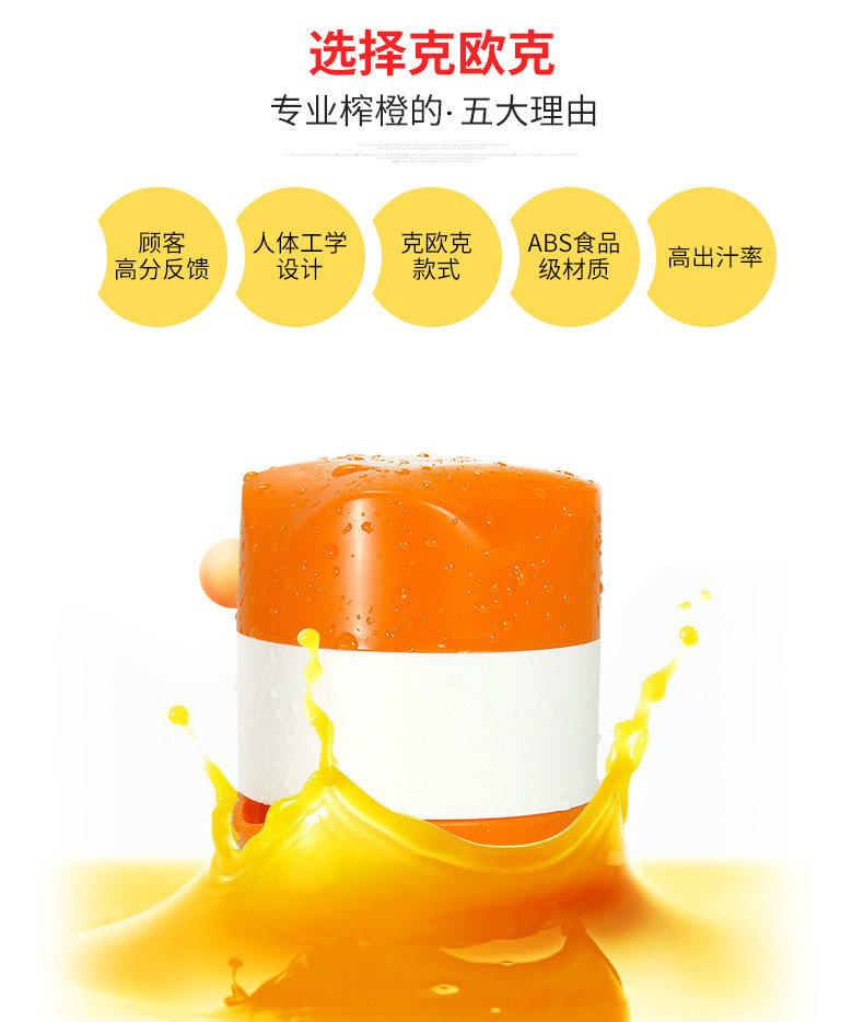 概要: 克欧克原厂正品,创意手动榨汁杯,轻松榨橙子、柠檬,好喝又营养。