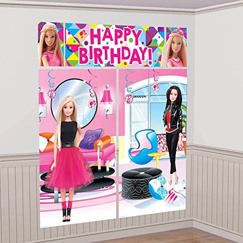 -. Binding : Toy -. Brand : Amscan -. Color : Multicolored -. Department : womens -. EAN : 0013051566845 -. Feature : Features a scene from inside Barbie's home with a "HAPPY BIRTHDAY!" headline printed in pink against a colorful geometric print / Made of light weight vinyl / Measures 59" x 65" / Package consists of 5 pieces -. Label : TradeMart Inc. -. Manufacturer : TradeMart Inc. -. Model : 670438 -. MPN : 670438 -. PackageQuantity : 1 -. PartNumber : 670438 -. ProductGroup : Toy -. ProductTypeName : TOYS_AND_GAMES -. Publisher : TradeMart Inc. -. Size : 59" x 65" -. Studio : TradeMart Inc. -. Title : Amscan Barbie Sparkle Scene Setters Wall Decorating Kit, Multicolored, 59" x 65" -. UPC : 013051566845 -. Warranty : No Warranty
