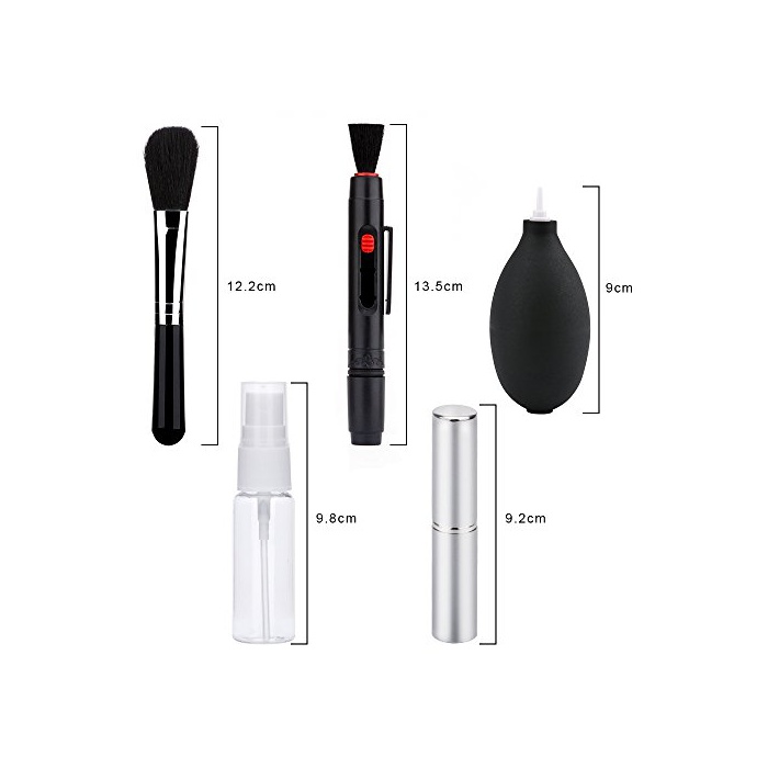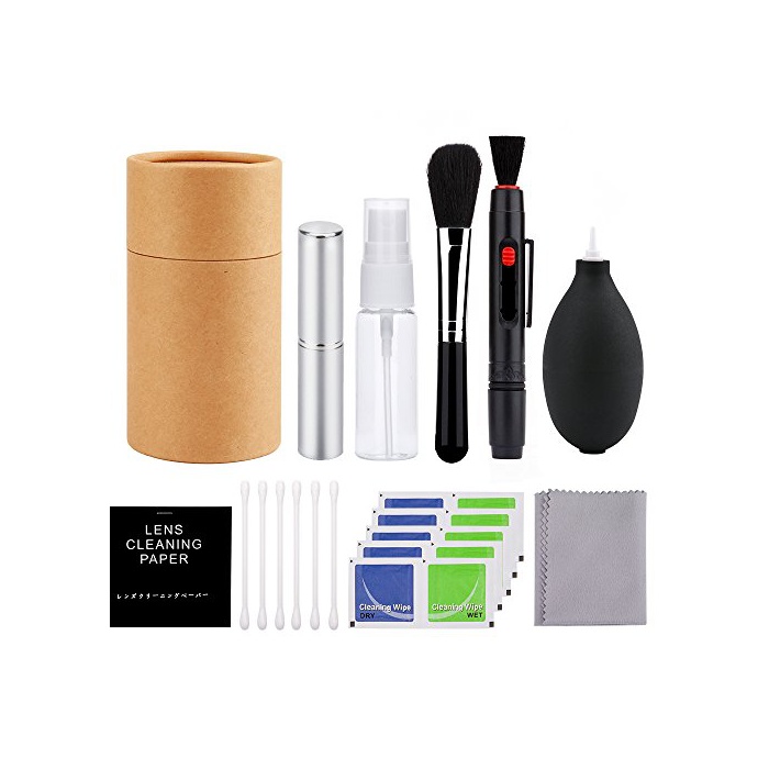 ◆카메라의 렌즈를 클리닝 할 때에 편리한 클리닝 용품10점 세트:1X 브로《아》 ;1X 렌즈필;1X 더스트 브러시;1X 클리너;1X 액체 스프레이 보틀(하늘의 보틀,클리너액이 없다,별매);1X 렌즈 페이퍼 20매;1X wipe 드라이 씨트;1X 클리닝 크로스;1X 면봉;1X 수납 박스.