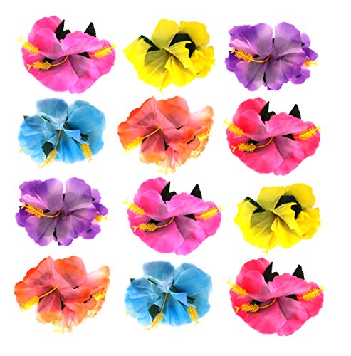 -. Feature : Pretty 5 inch hibiscus flower hair clips that will enhance any event, pack of 12 hair flowers. / Assorted colors simulated silk flowers with clips - it is easy to clip on to the hair and remove. / Celebrate in style - when each guest enters clip on one of these fashionable flower hair accessories. / Decorate your party with these pretty flower leis or hand them out to your guests as party favors. / Great for many occasions - tropical themed parties, luau parties, Hawaiian parties, and beach parties.