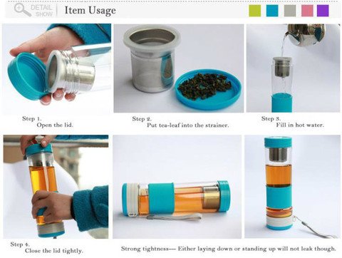 -. Feature : Light weight- Borosilicate Glass, Stainless steel, Silicone, Food Grade Materials / Leak-Proof / Will not deform- Heat resistance of -2 degrees to 110 degrees / Height- 22.5 cm Width- 6.5 cm / BOROSILICATE GLASS; Infuser Water Bottle is manufactured from durable, BPA free borosilicate glass. Glass Water Bottle won't leech chemicals or alter the taste!