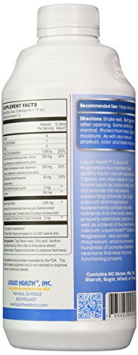 -. Binding : Health and Beauty -. Brand : Liquid Health -. EAN : 0765462005368 -. Feature : 100% Vegetarian / Double the Vitamin D / Superior Absorption -. IsAdultProduct : 0 -. Label : Liquid Health Products -. LegalDisclaimer : Actual product packaging and materials may contain more and different information than what is shown on our website. We recommend that you do not rely solely on the information presented and that you always read labels, warnings, and directions before using or consuming a product. Please see our full disclaimer below. -. Manufacturer : Liquid Health Products -. Model : 00536 -. MPN : 0806711 -. NumberOfItems : 1 -. PackageQuantity : 1 -. PartNumber : 0806711 -. ProductGroup : Health and Beauty -. ProductTypeName : HEALTH_PERSONAL_CARE -. PublicationDate : 2014-12-27 -. Publisher : Liquid Health Products -. ReleaseDate : 2014-12-24 -. Size : 32 oz -. Studio : Liquid Health Products -. Title : Liquid Health Products Calcium and Magnesium, 32 Fluid Ounce -. UPC : 765462005368