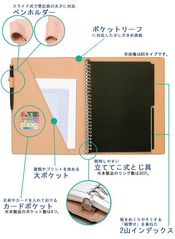 ルーズリーフやポケットリーフを自由に選んでセット出来ます。筆記具の太さに合わせられるスライドベルト式ペンホルダーやカードポケット、書類などを挟める大ポケットなどが付いて、とっても便利♪バインダーの縁をコバ塗りという技法で仕上げており、シャープで上品な印象に。 |