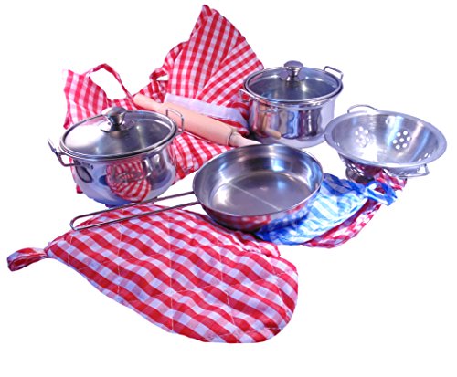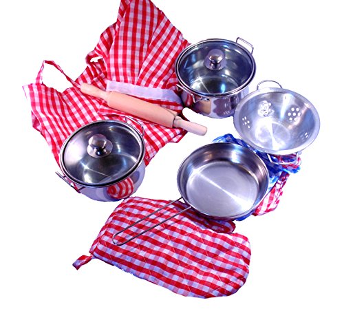 Mit diesem Kochenset für Kinder wird dein kleiner Koch oder Köchin ein Profi. Die vielen Komponenten ermöglicht es Ihren Kindern das Spielen als Koch in vollem Umfang zu genießen. Die Töpfe, Pfannen und das Sieb sind aus Edelstahl. Die Kleidung ist in Einheitsgröße.Feature