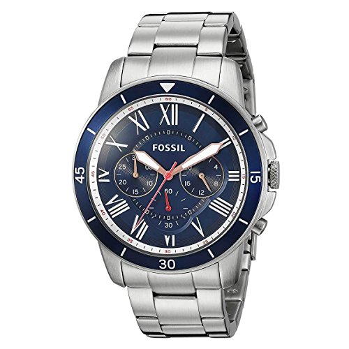 Watch Sizing Guide Find the perfect maritime companion with this Grant Sport watch from Fossil®! Stainless steel case. Silver-tone stainless steel bracelet with double push-clasp closure. Round face. Three-hand analog display with quartz movement. Navy dial features rose gold-tone hands and hour markers, three subdials, minute track, and Fossil detailing. Chronograph functionality. Rotating timing bezel. Water resistant 10 ATM. Display case included. Imported. Measurements: Case Height: 44 mm Case Width: 44 mm Case Depth: 12 mm Band Width: 9⁄10 in Band Circumference/Length: 10 in Weight: 5.4 oz This product may have a manufacturer's warranty. Please visit the manufacturer's website or contact us at warranty@support.zappos.com for full manufacturer warranty details.Feature