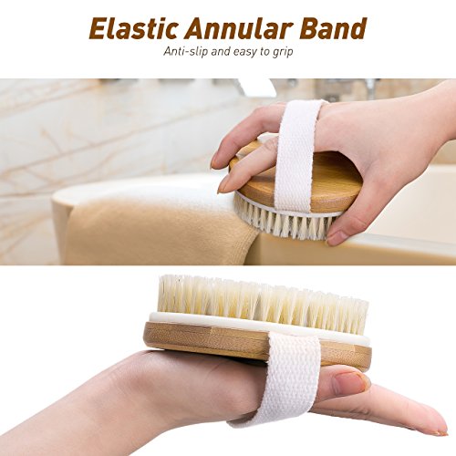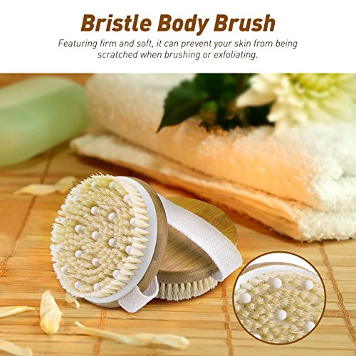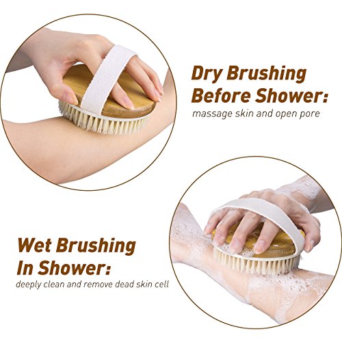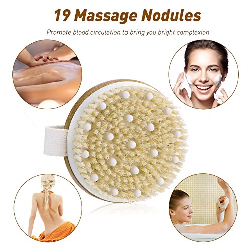 -. Feature : PREMIUM BAMBOO MATERIAL: Adopting high-quality bamboo, our shower brush is of incredible texture and touch. Comparing to other grass tree wood brush on the market now, this one is woodworm-free and not easy to be mildewed. / BRISTLE BODY BRUSH: The boar hair is firm yet soft enough to not irritate your skin. The sturdy bristle will not fall off. It is recommended to wet the brush by using hot water before brushing. / EASY GRIP DESIGN: The covering belt design will make you handle it easily without slipping. / 19 MASSAGE NODULES: Built-in 19 massage nodules, and you can use it to massage your body and promote the blood circulation, which is vital important for your health care. / ALL IN ONE: It is a versatile brush for clean skin, massaging body, promote blood circulation, improve sleeping quality, removing dead skin cell, etc. brighten your complexion and bring you smooth and radiant skin just like baby's.