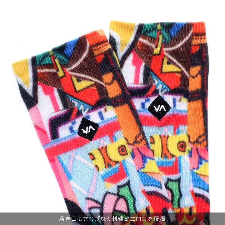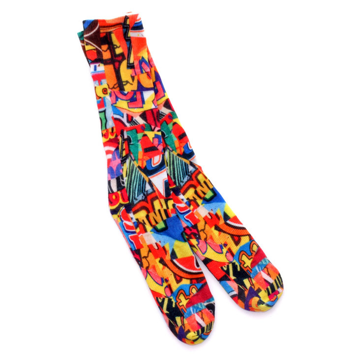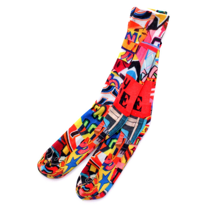 ポップなイラストをコラージュでソックス全面に落とし込み、ワンポイントのアクセントに刺繍ロゴを配置!!