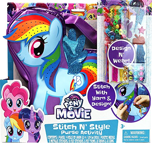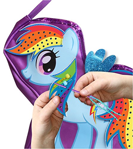 Design your very own My Little Pony fashion purse with sparkling yarn, beads, stickers, and gems!!Simply use the plastic needle and yarn to lace designs onto the Pony shaped purse. Once completed decorate with stickers and gems to finish your design!.Feature
