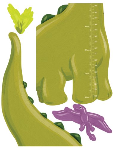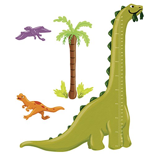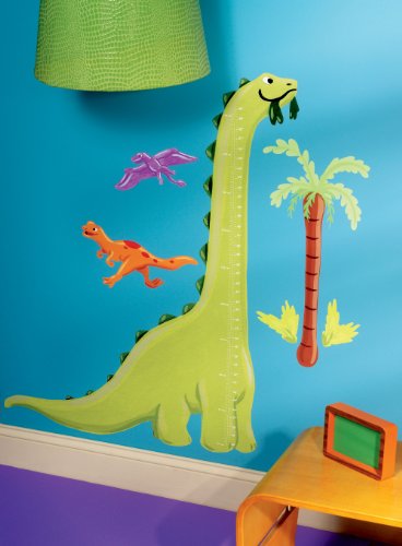 Wallies Dino Growth Chart Peel and Stick Wall Play mural is made of durable, self-adhesive backed vinyl that can be removed and repositioned easily. Have fun using your colorful Wallies Dino Growth Chart mural to help your child create their own unique design. To use, simply peel the pieces off of the backing in the package and apply to any clean, smooth surface or painted dry wall. This product is not recommended for textured or rough surfaces and should not be placed on newly painted walls, which usually need about 30 days to fully cure. To remove, simply peel and reposition to another area or return it to the original backing for storage. Wallies will not harm or damage surfaces and will not leave a sticky residue. Each package comes with 1 brontosaurus 14-Inch by 7¾-Inch, 1 pterodactyl 10½-Inch by 5¼-Inch, 1 pisanosaurus 14-Inch by 7¾-Inch 1 palm tree 11¼-Inch by 26½-Inch and 2 bushes 43⁄8-Inch by 5-Inch. All elements are in bright, vibrant colors. The package measures 21.5 inch by 4 inch by 2 inch.