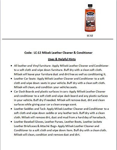 ReleaseDate : 2016-06-16 Studio : Milsek Furniture Polish, Inc Publisher : Milsek Furniture Polish, Inc Binding : Home Product Description Milsek Vinyl / Leather Cleaner and Conditioner can be used to clean and condition a variety of items including; furniture, car seats, dash boards, leather saddles and tack, baseball gloves, purses, boots, leather jackets, briefcases and more. Simply apply to a soft cloth, wipe down and buff dry with a clean cloth. Milsek Vinyl / Leather Cleaner and Conditioner will help clean by removing; dust, dirt and mud as well as condition the surface. Pack of 4 12-Ounce bottles included. 0