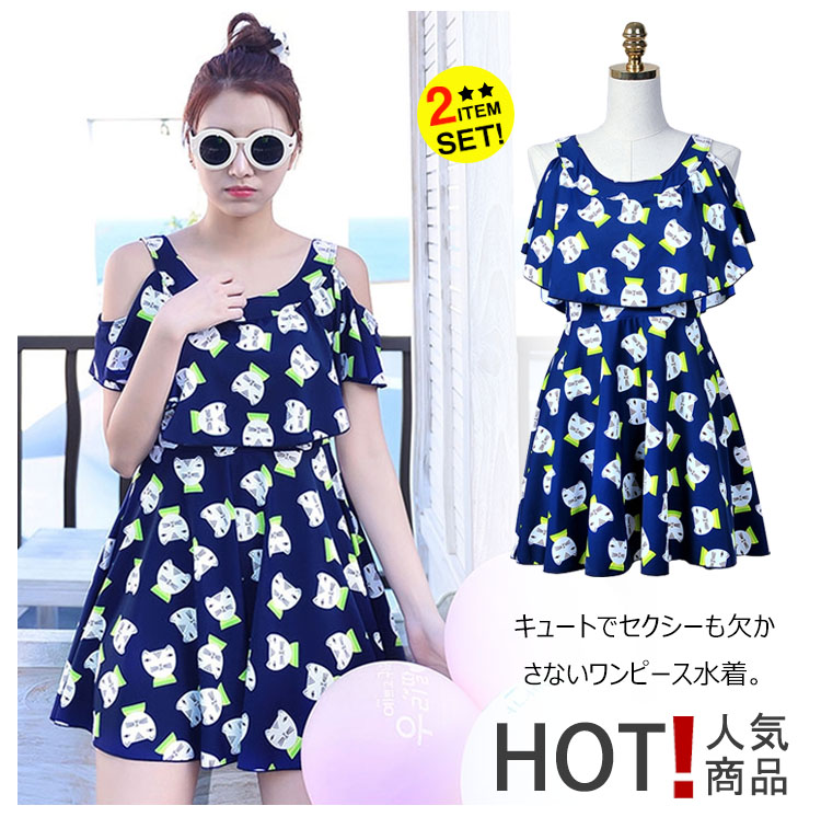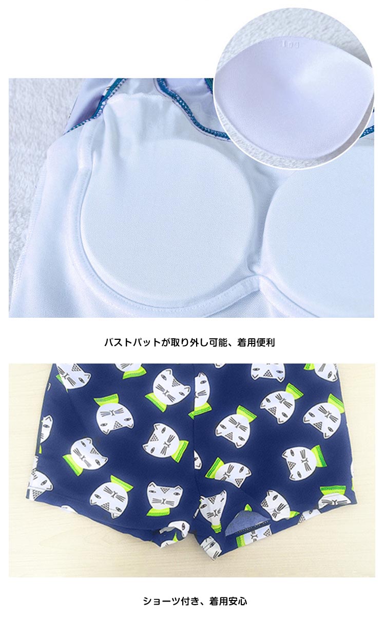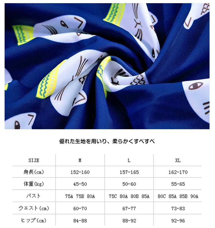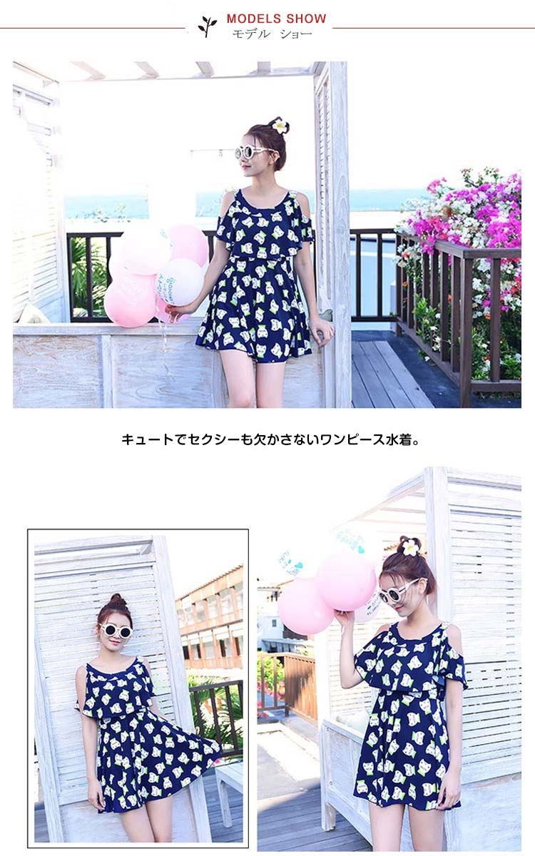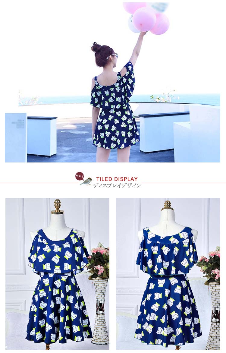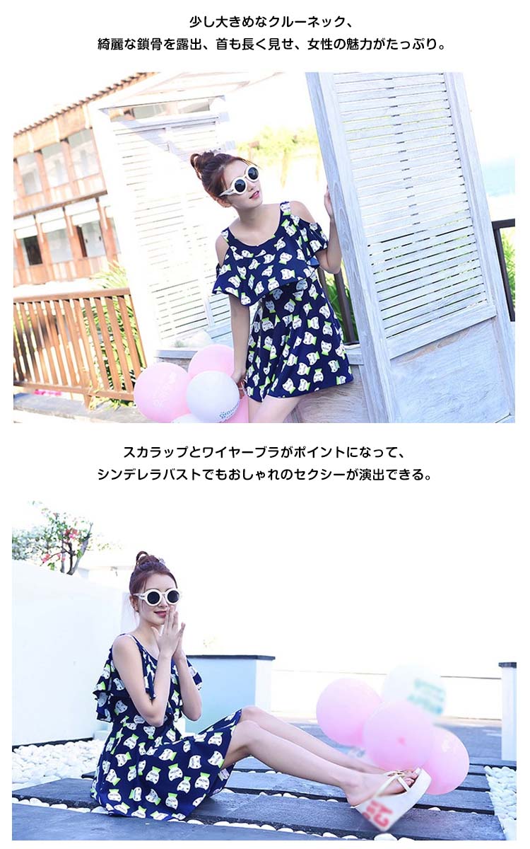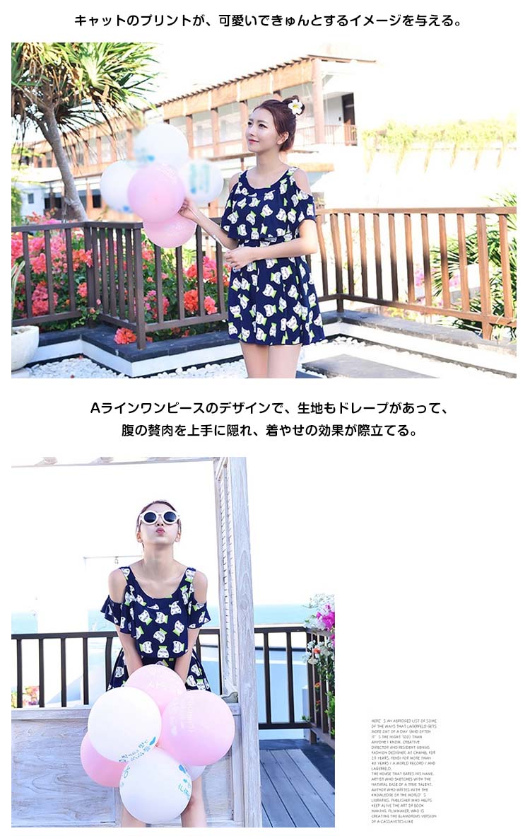 | キュートでセクシーも欠かさないワンピース水着。少し大きめなクルーネック、綺麗な鎖骨を露出、首も長く見せ、女性の魅力がたっぷり。スカラップとワイヤーブラがポイントになって、シンデレラバストでもおしゃれのセクシーが演出できる。キャットのプリントが、可愛いできゅんとするイメージを与える。Aラインワンピースのデザインで、生地もドレープがあって、腹の贅肉を上手に隠れ、着やせの効果が際立てる。 | |