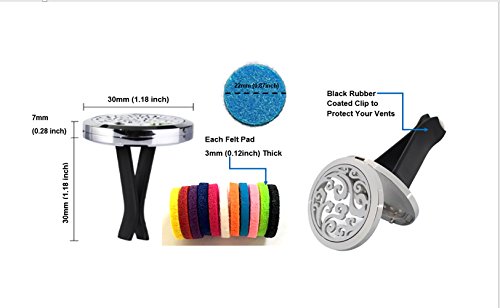 - EASY TO USE; Our bundle of car clip diffusers Come with 22 assorted colors sustainable refill pads; that provide variety, ease of use and long-life span for the product. You can color code your aroma, for example pair the purple with Lavender aroma. Each 11 refill pads come in a small transparent Ziploc plastic bag, that can be stored in your glove box for future use. In addition to an elegant black velvet pouch to store your clips. Just Open the locket and replace the felt pad as needed