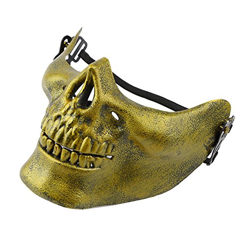 -. Feature : UNISEX! One Size fits most faces, heads, and sizes / Skeleton Skull Half Mask ideal for Cosplay, Parties, Dress Up, Pirates Day, Halloween, Events, Paintball, Sports, Outdoor activities, Conventions, and many more! / Allows for glasses, goggles, eyewear, helmets, and earphones / Eco-friendly, lightweight composite material, nontoxic and odorless / Impact Resistant and offers protection from dings scratches and airsoft