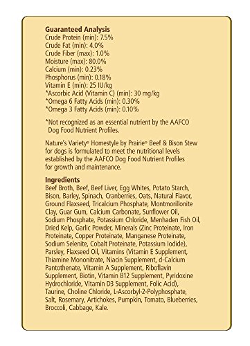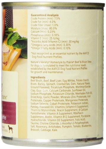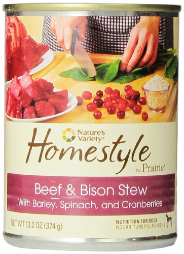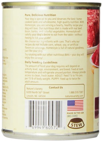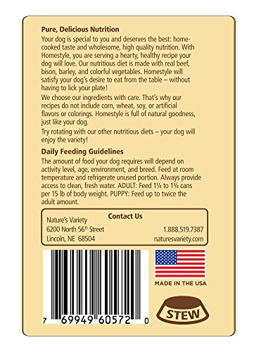 Homestyle cans deliver optimal nourishment through a variety of simple, natural ingredients. Fresh beef and bison, hearty whole grains, and fresh fruits and vegetables provide balanced, holistic nutrition for dogs. Only the highest quality ingredients have been selected for each of the Homestyle recipes - fresh meat, wholesome fruits and vegetables, and no corn, wheat or soy. complete and balanced for all life stages (including puppy, adult and senior). Made in USA facilities.Feature