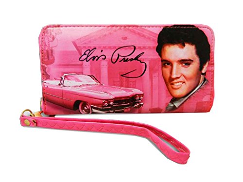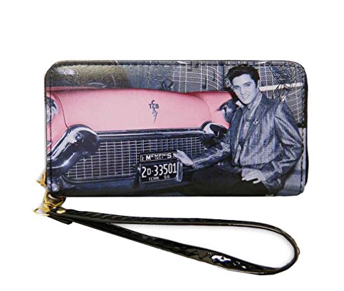 Elvis Presley around zip closure wallet is made with faux leather. Eight credit card slots, three compartments, and a zip pocket inside. The size is 7.5(L) x 4(H) x 1(W) inches. A detachable wristlet is included.Feature