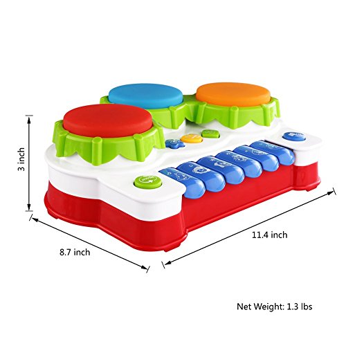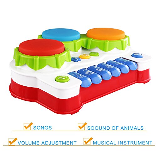 Multiple Early education content, 3 play modes: instruments, songs and animal sounds. Six piano buttons and six light-up music buttons introduce animals& sing-along songs. Fun sound effects of guitar, trumpet, sax and hand drums.