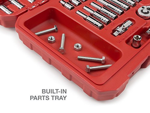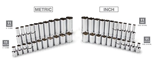 - Feature : Master set has every size from 5/32 to 9/16 inch and 5 to 14 mm in both shallow and deep lengths / Includes universal joint, screwdriver bit adapter and extra long 6-inch extension, tools not found in most other sets / Finely geared 72-tooth ratchet needs only 5-degree working swing arc / High-torque, 6-point sockets grip flat sides of fasteners, not corners, preventing round off / All tools are made from premium quality chrome vanadium steel with a mirror chrome plated finish