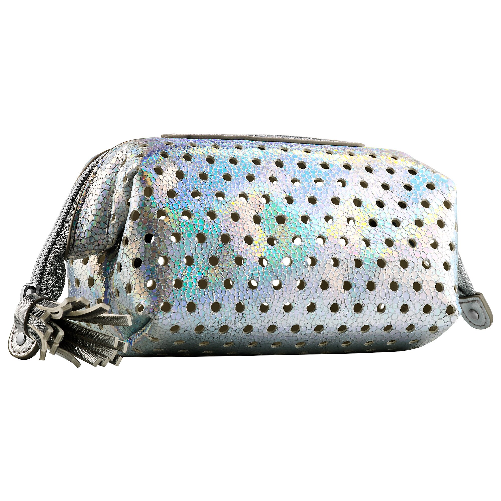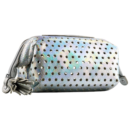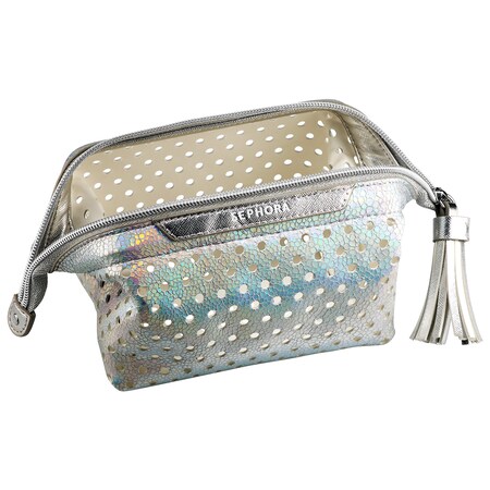 Store your makeup and beauty essentials and celebrate the refreshing new season with this limited-edition cosmetic bag. Its unique, framed opening allows for better visibility and accessibility to all your beauty essentials. It’s compact, but large enough to hold all of your makeup products and is easy to clean. The beautifully designed exterior features a holographic texture and a metallic tassel. The perforated exterior allows for a peek at what’s inside.