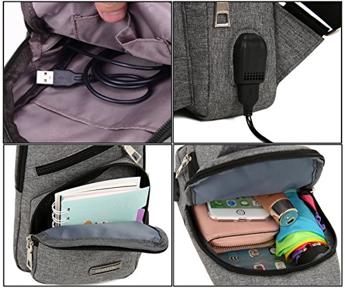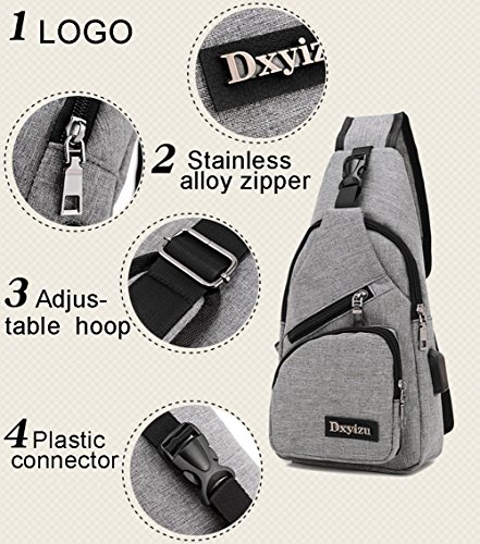 -. Feature : Material:sling backpack is made of sturdy and durable polyester,water repellent / Size:6.3*2.7*12.6 inch(L*W*H).With a long crossbody adjustable strap,smooth zipper. / Structure:three zippered main pockets, a small zippered pockets, a front anti-theft pocket. Roomy compartment to organize your cellphone, tablet, wallet, keys, ID card, credit card, small snacks. / Chest bag for men with external USB Interface: You can conveniently charge your phone, tablet and other devices.Please note:the USB cable is suitable for your battery,you need to plug your phone charger cable to the outside end. / Designed for comfort:can be used both as chest pack and shoulder bag, messenger bag, travel bag; Satchel strap is adjustable,fit both regular and plus-size person.
