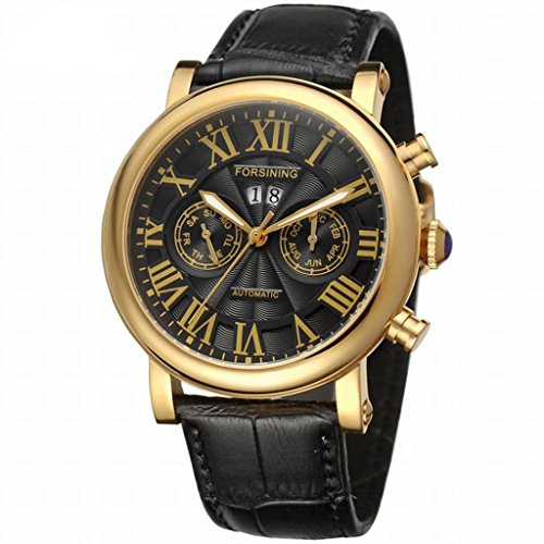 -. Title : GuTe出品 自動巻き 腕時計 メンズ 革バンド 日付 シンプル カレンダー ローマ数字 機械式 ゴールド 黒