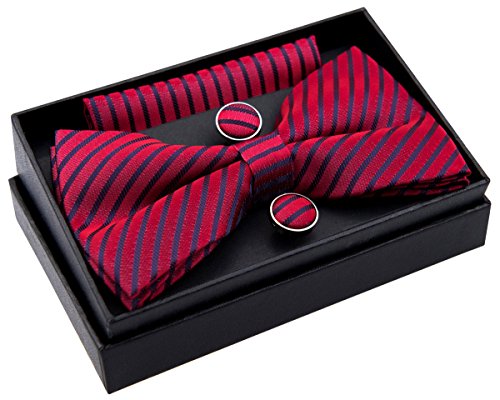 -. Feature : Pre-Tied Bow Tie with adjustable strap, 100% Polyester Microfiber, Width: 5 inches, For Necksize up to 19 inches / Pocket Square, 11.5" x 11.5" / Cufflinks, Diameter: 0.6" / Free gift box, contains: 1 x Bow Tie, 1 x Pocket Square and 1 pair of Cufflinks / Care Guide: Dry Clean Only