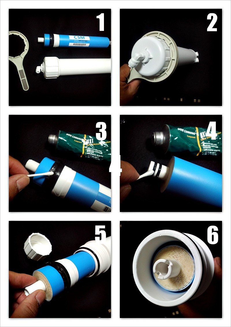 | ■1:逆浸透膜浄水器用の膜の交換手順です。写真は韓国製のCSMメンブレンが 写ってますが、フィルムテックも同じ方法です。 |