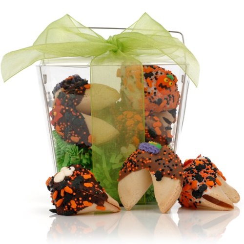 -. Feature : 6 Hand Dipped Vanilla Fortune Cookies dipped in your choice of chocolates & caramel / Each Cookie is smoothered in Halloween Themed Candy SP.R.Inkles & non-pariels and finished with a hand crafted Halloween Royal Icing Decor / Each set is packaged inside a clear Take out Pail complete with lime green crinkle & lime green Chiffon Ribbon. / All our Products are KSA Kosher Dairy / Leave a spooky messages for your loved one in the Gift Message box!