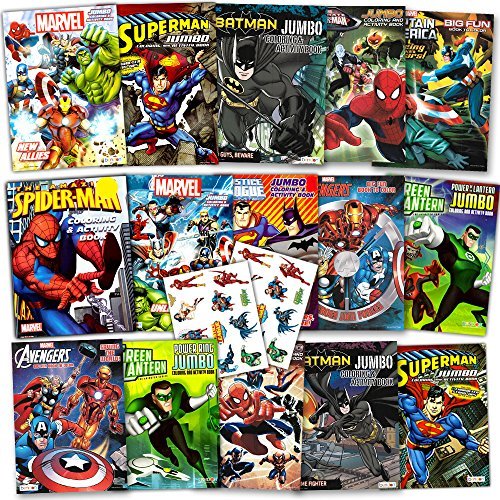 -. Feature : Marvel Comics and DC Comics superheroes come together in this exciting coloring book set! Includes a bonus -- over 30 Justice League stickers. / Fifteen different coloring and activity books, each featuring a different Superhero! / Includes the following assort: Avengers (2 Books), Justice League (1), Batman (2), Superman (2), Spiderman (3), Thor (1), Green Lantern (2), and Marvel Heroes (2)! 15 Books total --Thor/Superman cover art may vary. / Books measure approximately 8" x 10.75" and have about 96 pages each (please note that two titles have a different format -- 1 Justice League title is 5"x8" with stickers, and 1 Spiderman title has 24 pages). / Perfect as super hero party supplies and party favors. These coloring books will provide many hours of super-hero fun with games, puzzles, mazes and coloring activities. Sure to be a hit with any superhero enthusiast!