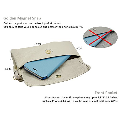 This smartphone wallet seems to be very elegant and compact, but don't be fooled by its appearance. 3 full length pocket can suit your needs to fit your big size smart phone besides your cash, such as iPhone 6 Plus, Samsung Note 3, Note 4, but don't put a bulky cover on the phone, or it will not fit. 6 credit cards slots can even fit 12 cards in total, and front pocket can fit 12 dollar bills nicely even with a checkbook.