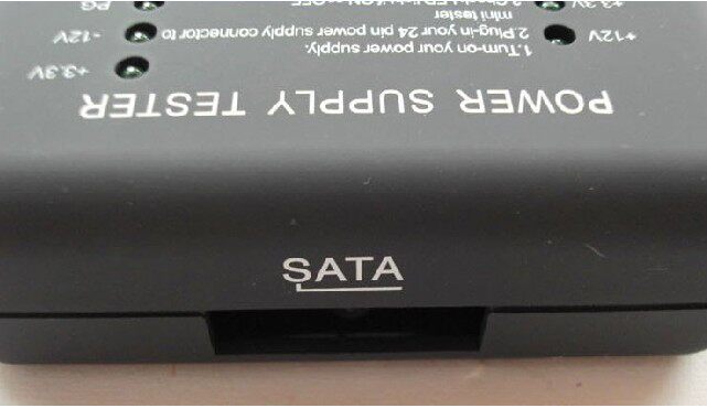 7. 从电源测试仪拔出FLOPPY插头,再插入SATA插头到相对应的SATA插座里,查看左边三个灯(+12V, +3.3V,+5V)是否亮,全亮为好