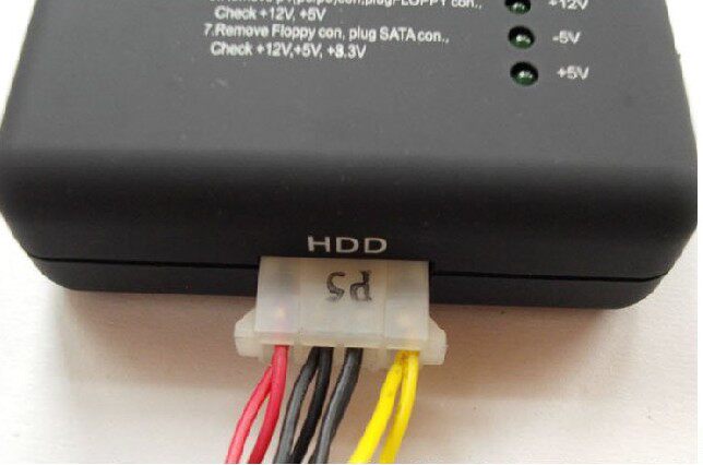 4. 把待测电源HDD插头插入电源测试仪HDD插座里,查看左边两个灯(+12,+5V)是否亮, 全亮为好