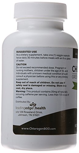 The Leading Edge LEM00073 Chlorogen800 Green Coffee Bean Extract uses high quality unroasted coffee beans with 50-percent chlorogenic acid to offer long-term, sustainable and healthy weight loss. Chlorogen800 works by helping keep you satiated and reducing the conversion of fat from carbohydrates in your daily diet. You'll eat less, naturally, without diet pills, and minus the guilt that you shouldn't be eating. The pill is 100-percent natural and contains 50-percent chlorogenic acid, which is a notable 30-percent higher than weaker products. When you don't have time to diet or hit the gym, the Chlorogen800 will burn fat for you or take it as part of a mix of cardiovascular and resistance training for increased results. Take Chlorogen800 twice a day and watch the pounds come off. Chlorogen800 works to maximize your healthy weight management. Since 1999, Leading Edge Health has been an industry leader in providing digestive health, anti-aging, skin care and general health products designed to make you feel more youthful, attractive and vibrant without the use of harmful prescription drugs. Created by medical professionals and with more than 50,000 affiliate partners worldwide the Leading Edge Health brand is a trusted source for quality products you can feel good about using.Feature
