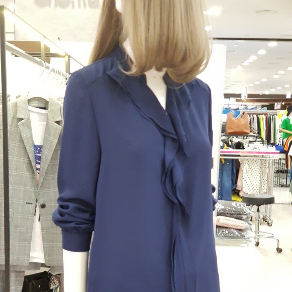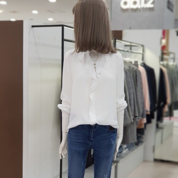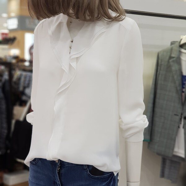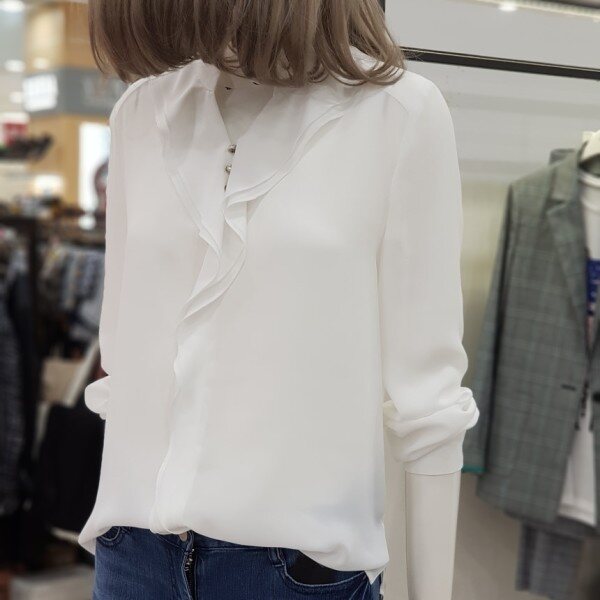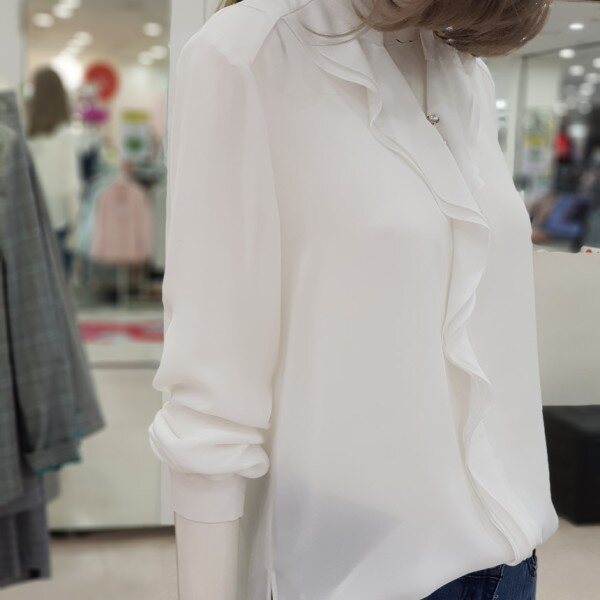 깔끔하고 데일리하게 입기 좋은 블라우스 입니다.갸름한 V넥과 더불어 세련되게 흐르는 러플이 매력적인 상품으로 청바지로 캐쥬얼하게 정장스럽게 입으셔도 두루두루 다 잘 어울리는 상품입니다.사이즈는 55.66입니다