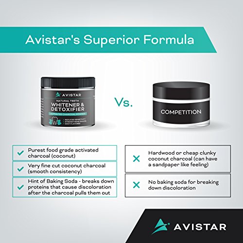 Avistar's Secret Formula - We fine cut our organic activated coconut charcoal and add a bit of baking soda to our formula, which is key to breaking down proteins that cause discoloration after the activated charcoal pulls out stains. Most companies use cheap hardwood or non-fine cut coconut charcoal, which is very clumpy and feels like sandpaper on your teeth.