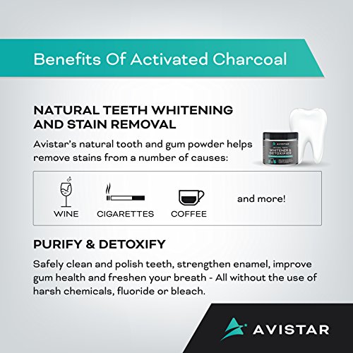Specifically formulated to clean, improve gum health, freshen breath, polish and whiten! Avistar's fine cut activated coconut charcoal powder allows for teeth whitening and detoxification without harsh chemicals and is free from: GMOs, preservatives, fluoride, artificial colors/flavours and animal testing.