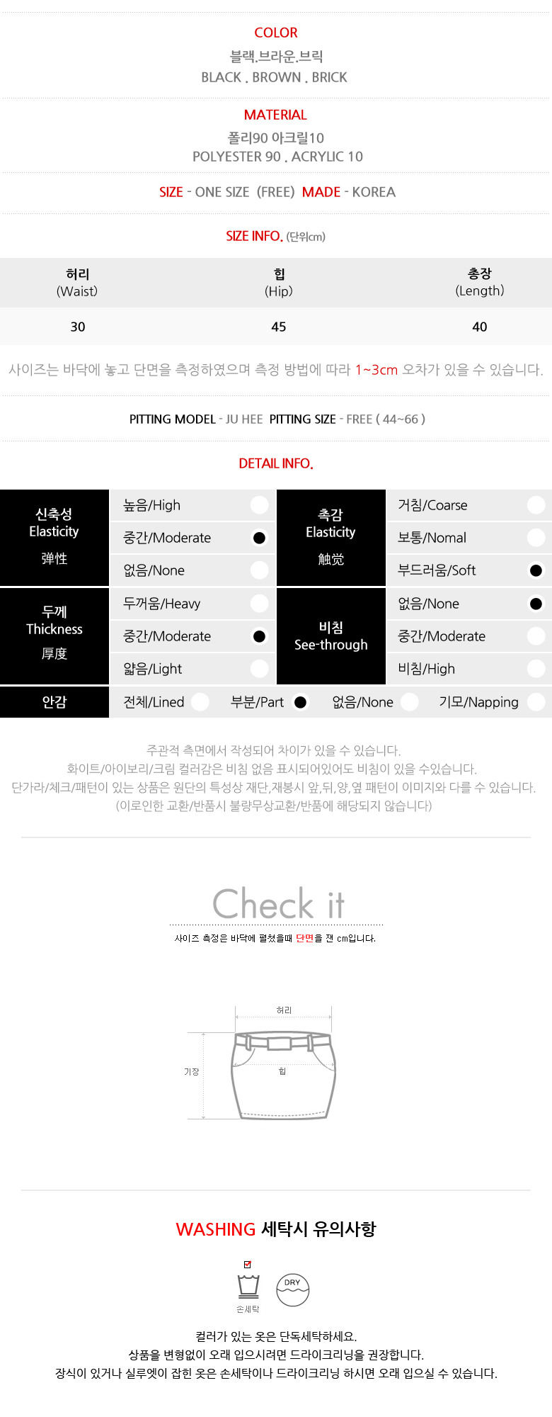 ![]() MD COMMENT 겨울시즌에도 착용하기 좋은 모직스커트 소개해요 미니한 기장감의 자연스럽게 퍼지는 플레어밑단으로 슬림한 레그라인을 연출해주구요 러블리한 분위기로 연출이 가능해요 도톰한 두깨감으로 겨울시즌에도 무리없이 착용가능하구요 니트나 티셔츠등 다양한 상의아이템들과 함께 손쉬운 스타일링이 가능한 스커트에요 DETAIL TIP 폴리90% 아크릴10% 소재로 제작되었어요 전체 안감처리로 부드럽게 착용가능하구요 옆라인 지퍼로 오픈 클로징 가능해요 신축성은 없지만 허리 뒷라인에 밴딩처리되어있어 편안하게 착용 가능해요 SIZE TIP 원 사이즈 제품이며 44~66 사이즈까지 프리하게 착용할 수 있는 아이템이에요 착용컬러 : 블랙 착용모델 : Ju Hee ![]() ![]() ![]() ![]() ![]() ![]() ![]() ![]() ![]() ![]() ![]() ![]() ![]() |