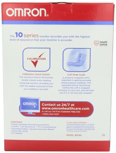 -. Binding : Health and Beauty -. Brand : Omron -. Color : Black/White -. EAN : 0693614783638 -. Feature : No. 1 Doctor and Pharmacist Recommended Brand / Dual sensors automatically double check each reading, providing you with added reassurance that each reading is accurate / Advanced Averaging feature automatically displays the average of up to the last 3 readings taken within the last 10 minutes / Hypertension Indicator icon alerts you if your reading exceeds internationally recognized guidelines for normal home blood pressure levels / Detects irregular heartbeat and alerts you with a special indicator icon so you can consult with your physician -. IsAdultProduct : 0 -. IsAutographed : 0 -. IsMemorabilia : 0 -. Label : Omron -. Manufacturer : Omron -. Model : BP785 -. MPN : BP785 -. NumberOfItems : 1 -. PackageQuantity : 1 -. PartNumber : BP785 -. ProductGroup : Health and Beauty -. ProductTypeName : HEALTH_PERSONAL_CARE -. Publisher : Omron -. ReleaseDate : 2011-01-17 -. Size : Large -. Studio : Omron -. Title : Omron BP785 10 Series Upper Arm Blood Pressure Monitor, Black/white -. UPC : 913201404228 -. Warranty : 5 Years