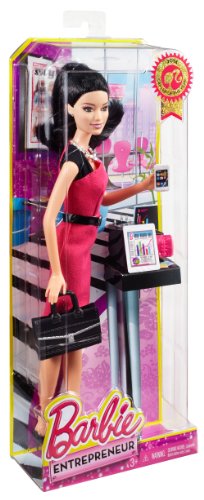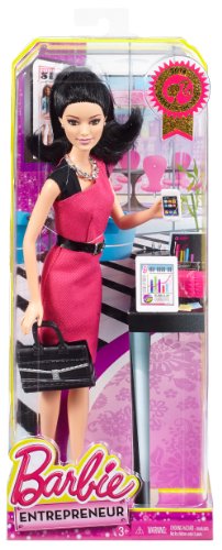 Barbie doll is ready to make a bold business move and strike out on her own to achieve her career dreams! Entering the entrepreneurial world, this independent professional is ready for the next big pitch. Barbie Entrepreneur doll wears a sophisticated dress in signature pink that features modern color blocking and a sleek silhouette. Her "smartphone," tablet and briefcase are always by her side. And luxe details, like a glam necklace, cool clutch and elegant hairstyle, add professional style statements for a smart, stylish professional. Includes Barbie doll wearing career fashion and accessories, clutch, briefcase, tablet and smartphone. Doll cannot stand alone. Ages 3 and older.Feature