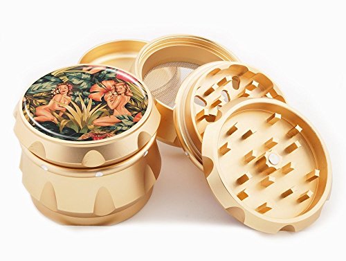 Jungle Girl Gold Herb Grinder 2.25" Wide 4 Piece Premium Quality Aerospace Grade Aluminum Metal Grinders Golden Case Sexy Pin Up Girl Bad Girls - Black Felt bag and Gift Box!