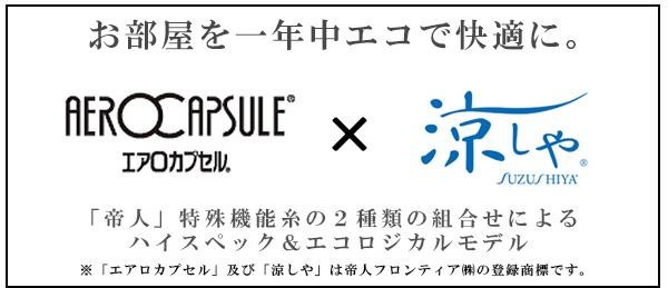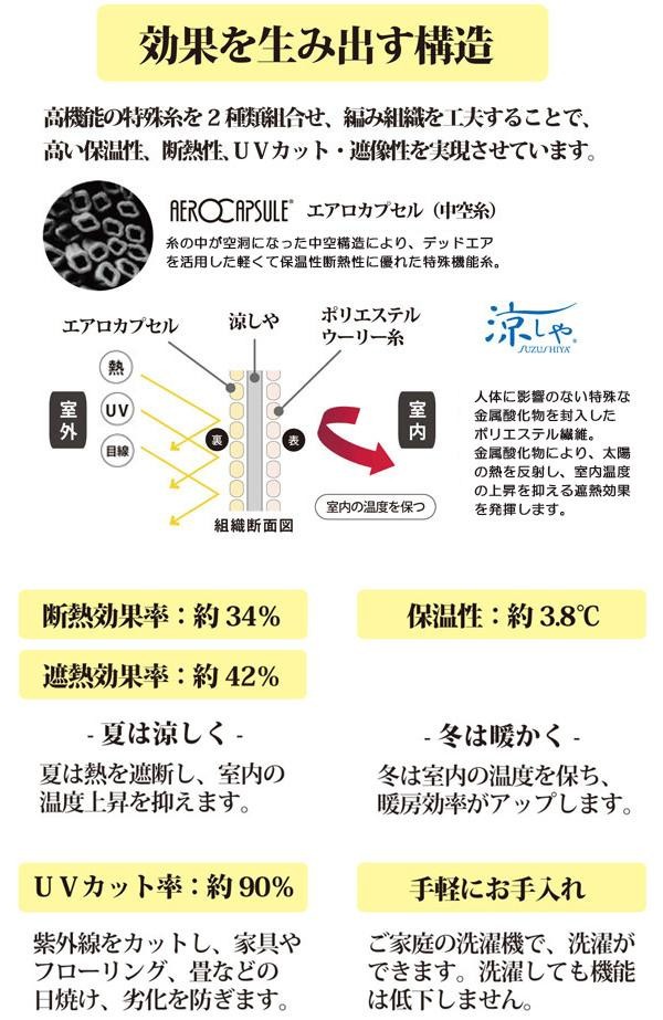 | 帝人の特殊機能糸「エアロカプセル」と「すずしや」を編みこみ、高い機能性を持たせたレースカーテン。ミラー仕様ではないナチュラルな風合いを持ちながら、UVカット・断熱性・保温性・遮像性にも優れ、1年中エコで快適に使用する事が出来ます。どんな空間にも馴染みやすいオーソドックスなデザインも魅力の1つです。 |