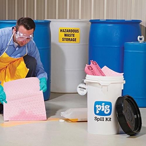 -. Feature : Polyethylene bucket with easy-open, screw-on lid can be used to ship or temporarily store used absorbents / PIG HazMat Socks stop spreading spills; PIG HazMat Pads absorb quickly / PIG HazMat Absorbents are specially treated for unsurpassed performance with concentrated corrosives, such as 98 percent sulfuric acid and 30 percent sodium hydroxide / Prepacked container provides easy access to contents / Large, color-coded label makes identification fast and accurate