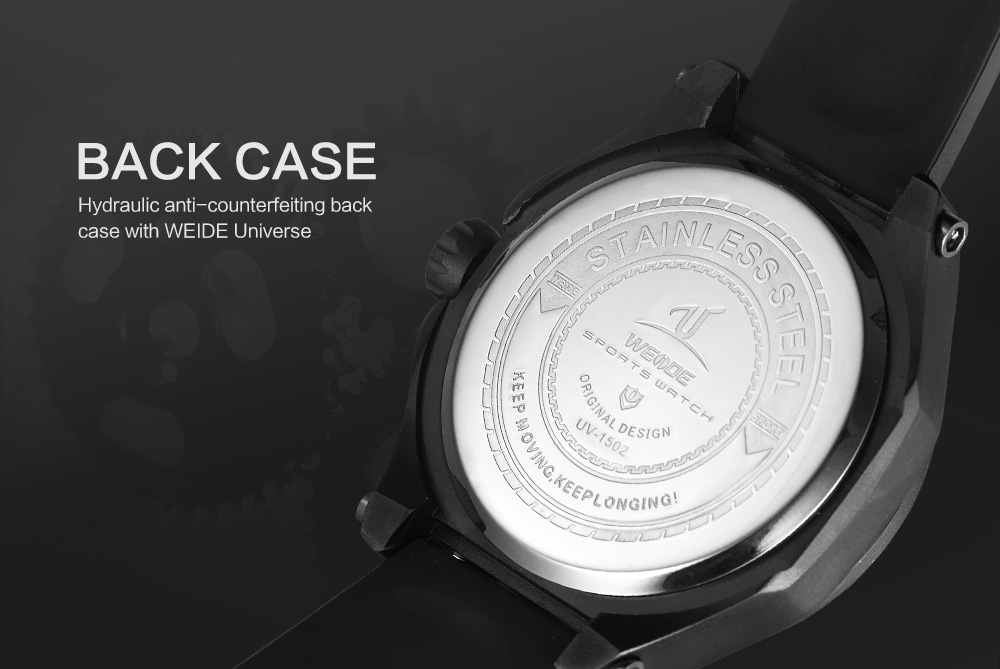 Jam tangan Weide UV1502 menggunakan modul digital dan analog Quartz Japan yang dapat menampilkan hari、 tanggal、 dan waktu. Strap terbuat dari bahan material silicone yang lentur、 tahan air hingga kedalaman 30 Meter.