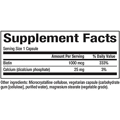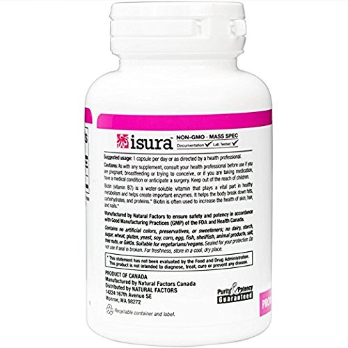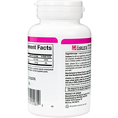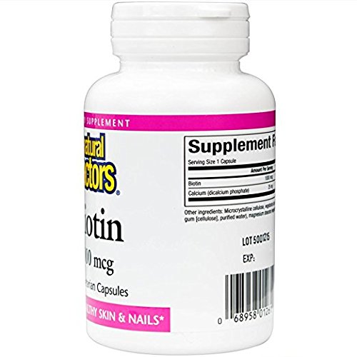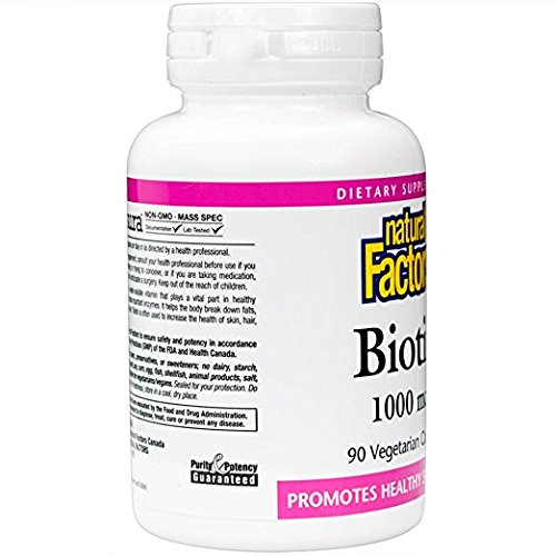 Studio : Natural Factors Publisher : Natural Factors Binding : Health and Beauty Product Description Biotin 1000 mcg by Natural Factors 90 VegCap Biotin 1000 mcg 90 VegCap Biotin (vitamin B7) is a water-soluble vitamin that plays a vital part in healthy metabolism and helps create important enzymes. It helps the body break down fats carbohydrates and proteins. Biotin is often used to increase the health of skin hair and nails. Supplement Facts Amount Per Serving Daily Value Biotin 1000 mcg 333 Calcium (dicalcium phosphate) 25 mg 3 Percent Daily Values are based on a 2 000 calorie diet Other Ingredients Microcrystalline cellulose vegetarian capsule (carbohydrate gum (cellulose) purified water magnesium stearate(vegetable grade) Warnings Keep out of reach of children. As with all dietary supplements consult your healthcare professional before use. See product label for more information. 0