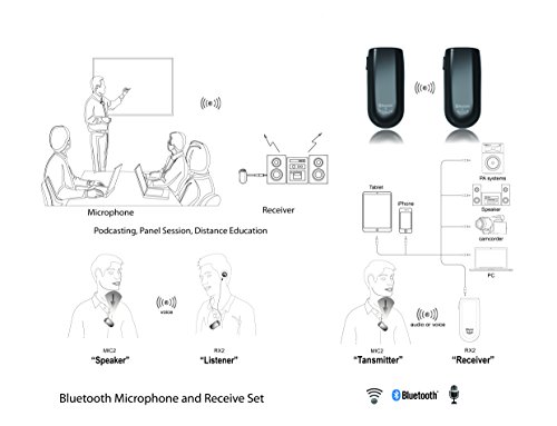 Alead MICRX2 Bluetooth Wireless Microphone and Receiver Set is a new generation of wireless voice transmitter and receiver solution with long range, low latency, lip sync and clarity sound for real time distance education, webinar, conference, panel session, PA systems, speech recognition, hearing impairment, VoIP, PC audio, voice recording, YouTube,