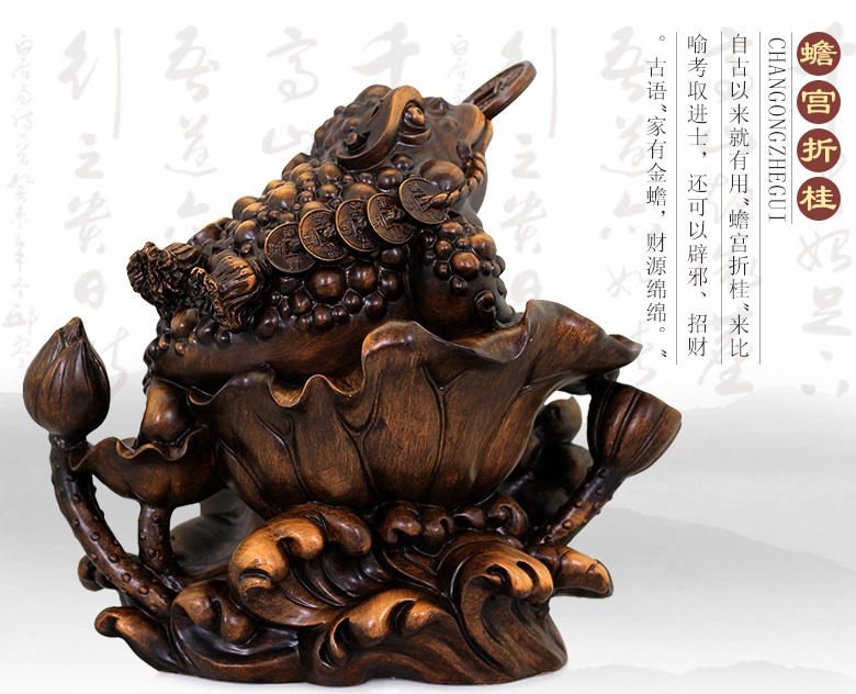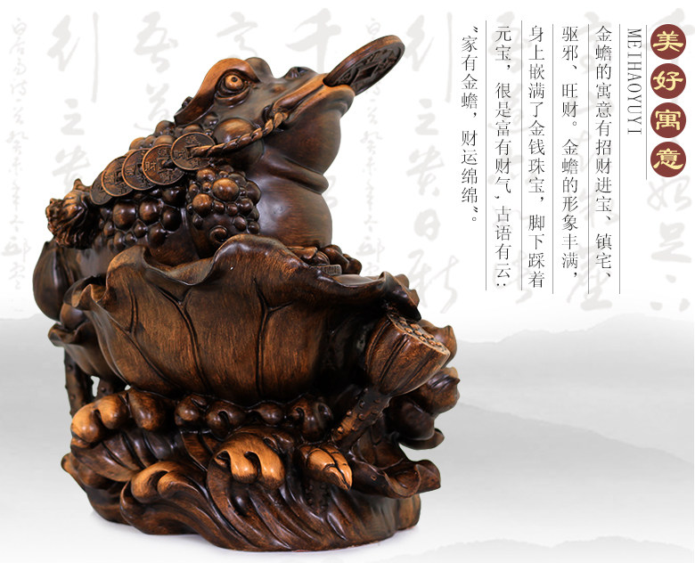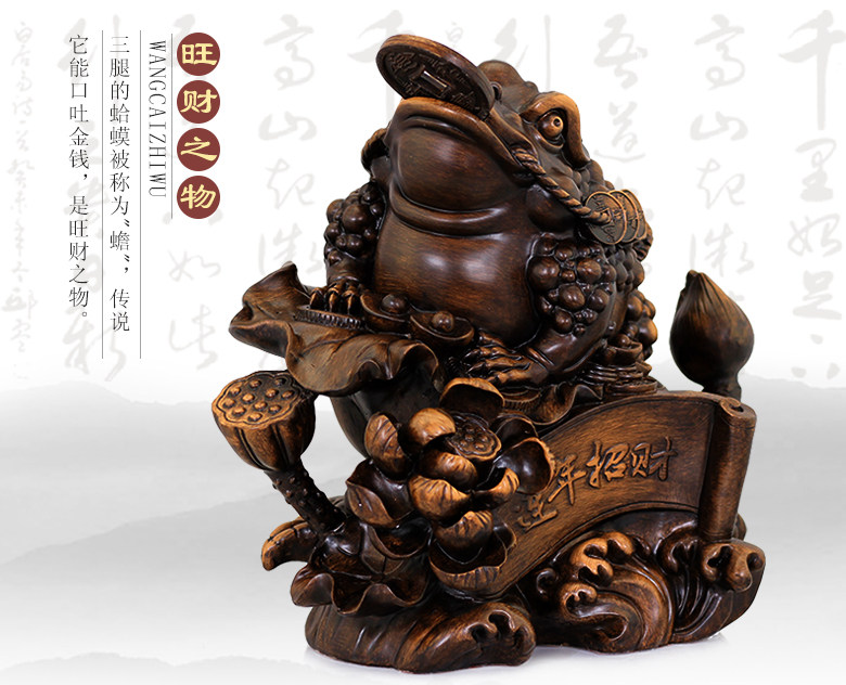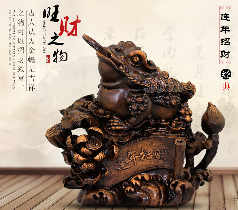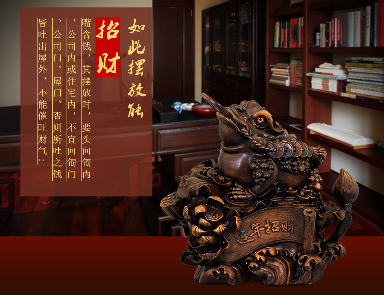 商品特点:金蟾口吐金钱,是招财的吉祥物,三足,背上北斗七星,嘴衔金钱,背负铜钱。三脚金蟾所居之地,都是聚财之宝地,宅内摆放金蟾,有吸财、吐财、聚财、镇财的作用。
